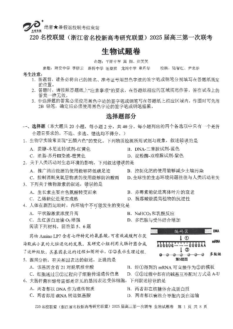 浙江省Z20名校联盟(浙江省名校新高考研究联盟)2025届高三第一次联考+生物