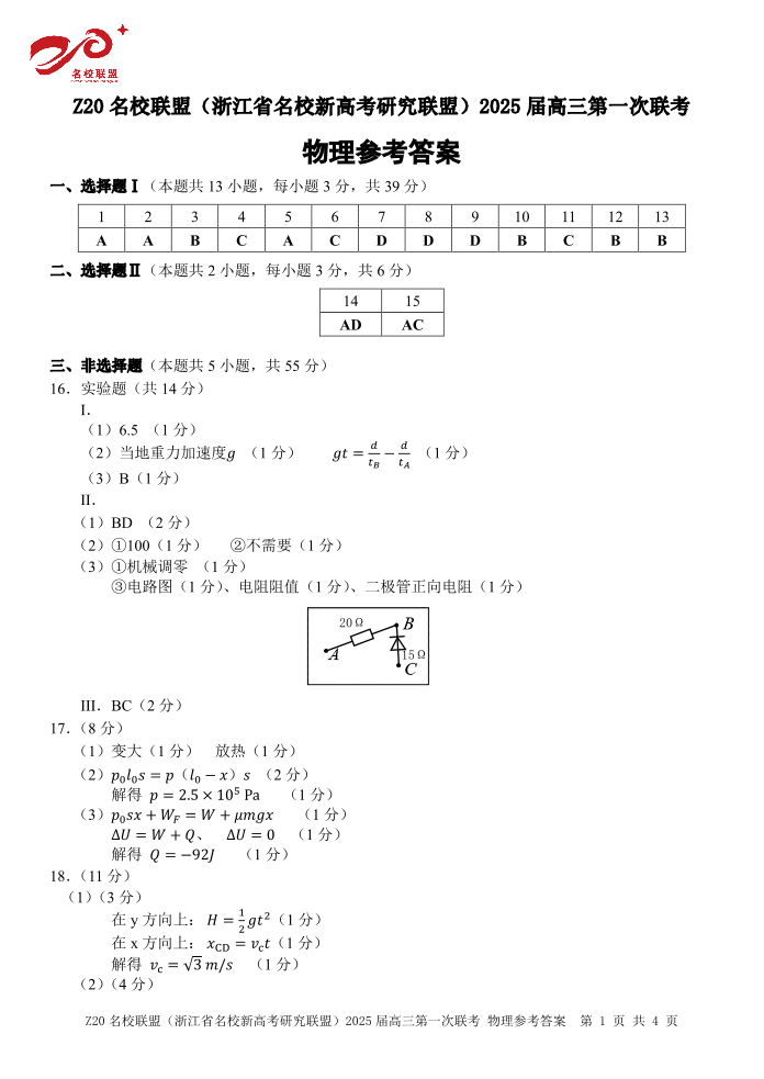 浙江省Z20名校联盟(浙江省名校新高考研究联盟)2025届高三第一次联考+物理答案