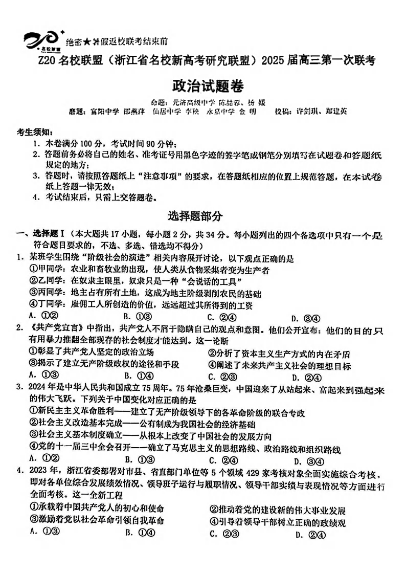 浙江省Z20名校联盟(浙江省名校新高考研究联盟)2025届高三第一次联考+政治