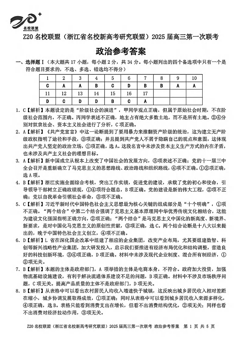 浙江省Z20名校联盟(浙江省名校新高考研究联盟)2025届高三第一次联考+政治答案