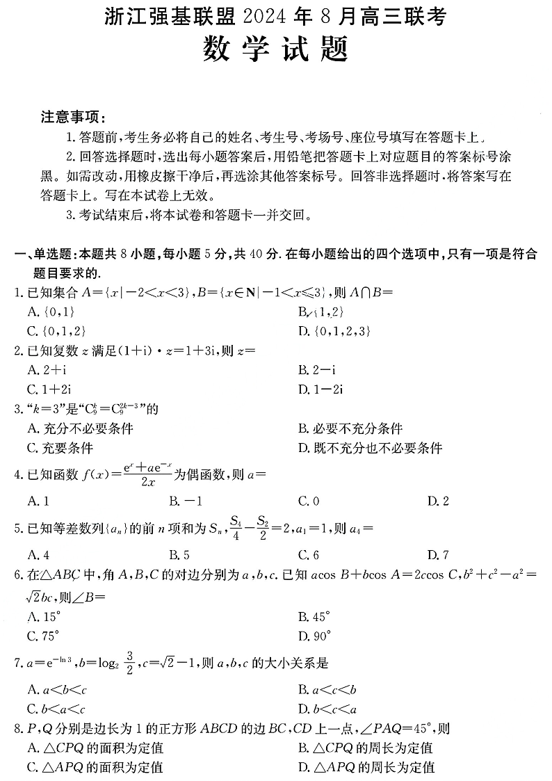 浙江强基联盟2024年8月高三联考+数学