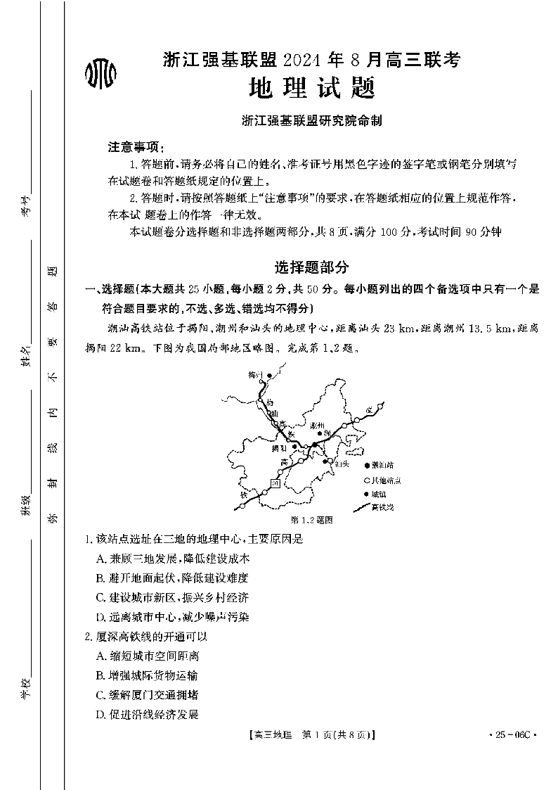 浙江强基联盟2024年8月高三联考+地理