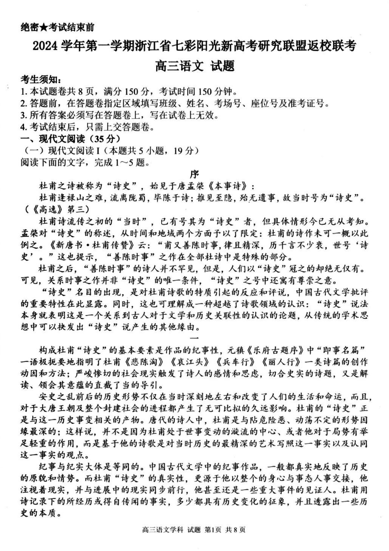 2024学年第一学期浙江省七彩阳光新高考研究联盟返校联考+语文