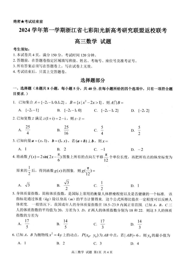 2024学年第一学期浙江省七彩阳光新高考研究联盟返校联考+数学