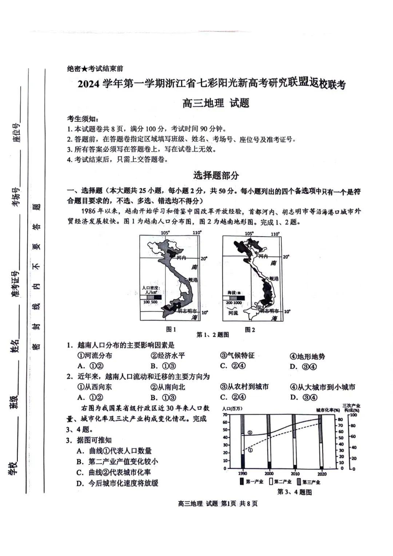 2024学年第一学期浙江省七彩阳光新高考研究联盟返校联考+地理