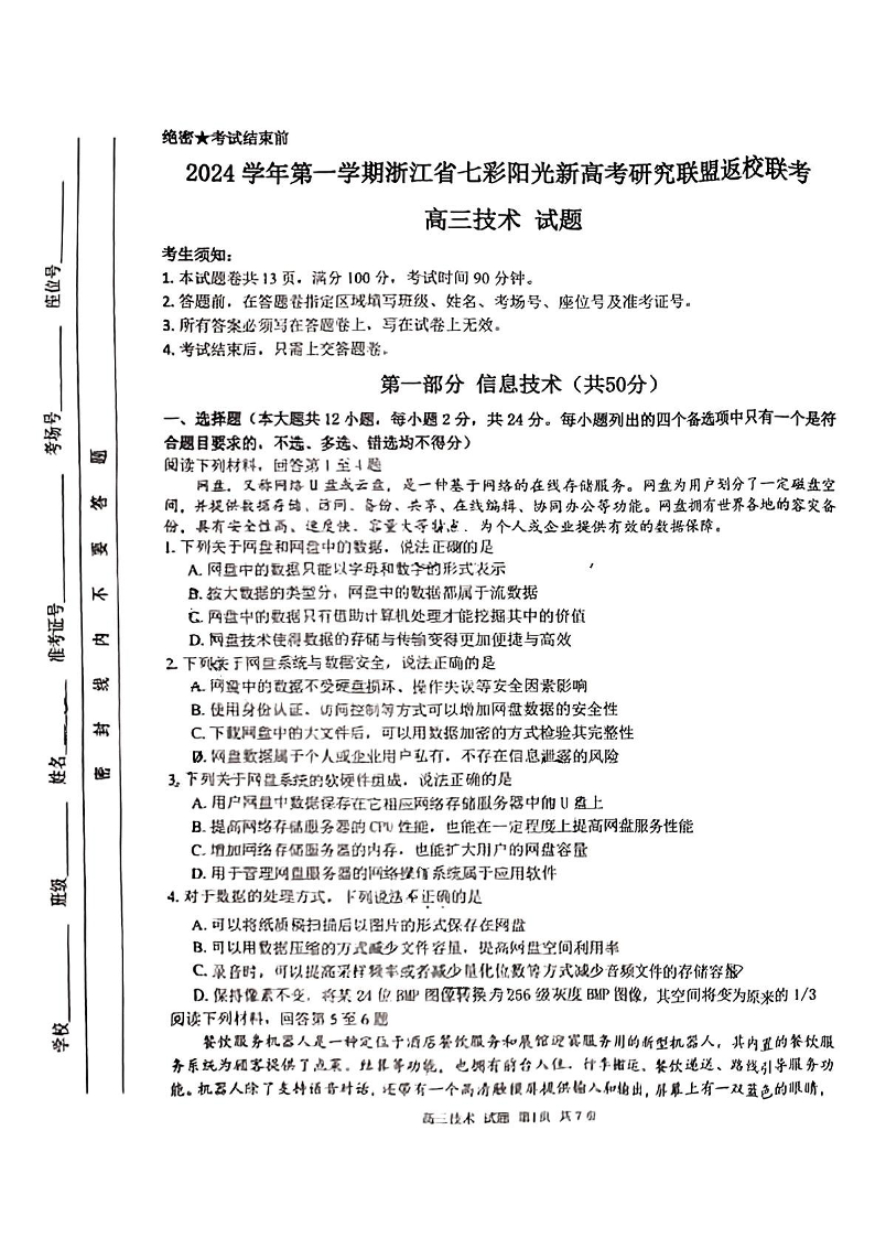 2024学年第一学期浙江省七彩阳光新高考研究联盟返校联考+技术