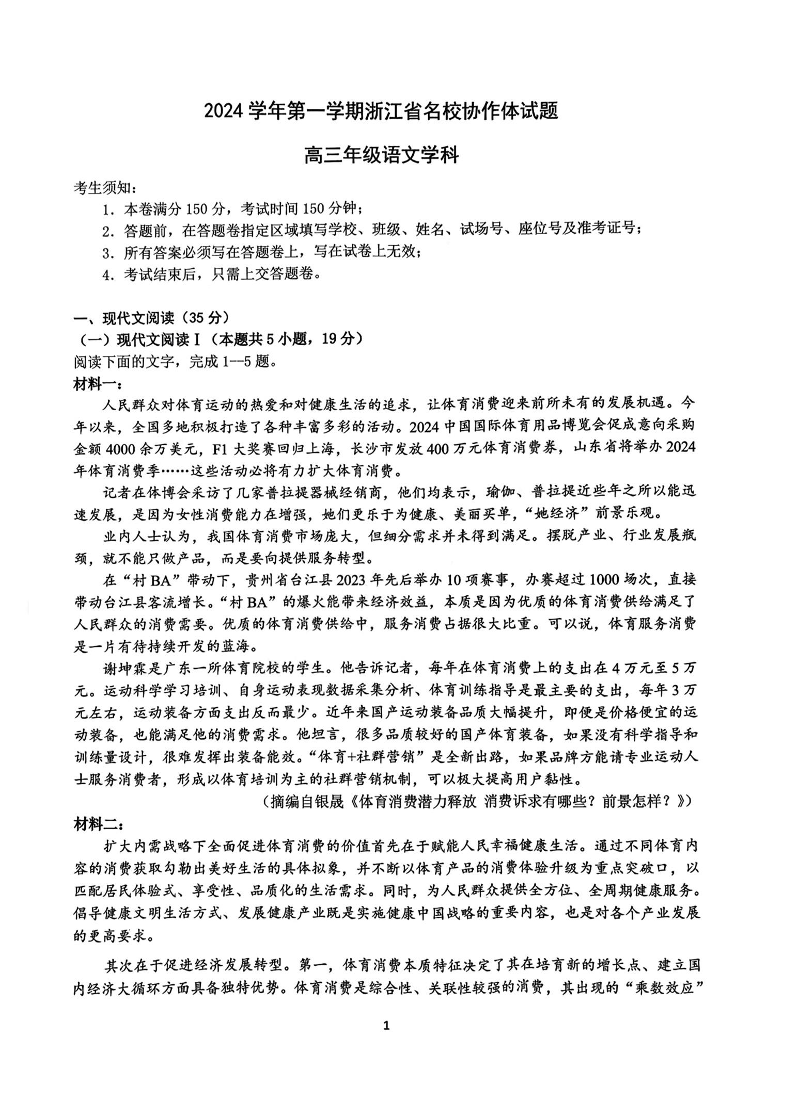 2025届浙江省G12名校协作体高三返校考+语文