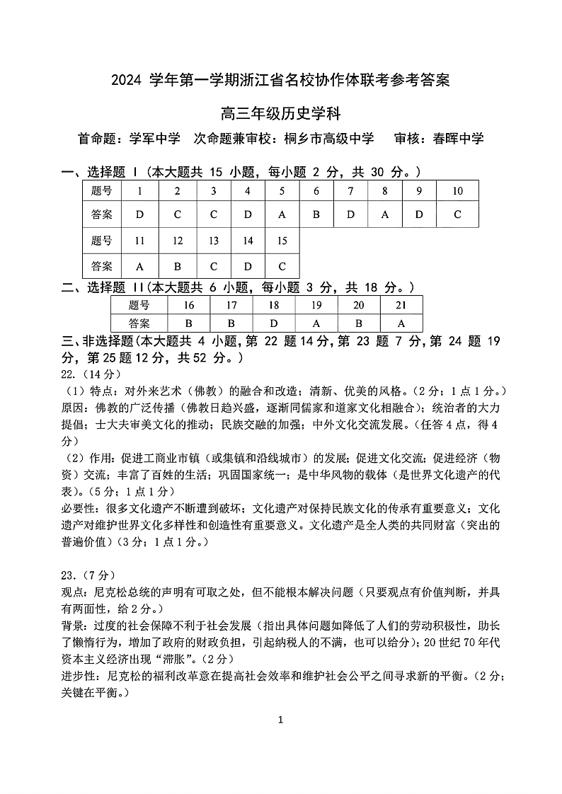 2025届浙江省G12名校协作体高三返校考+历史答案