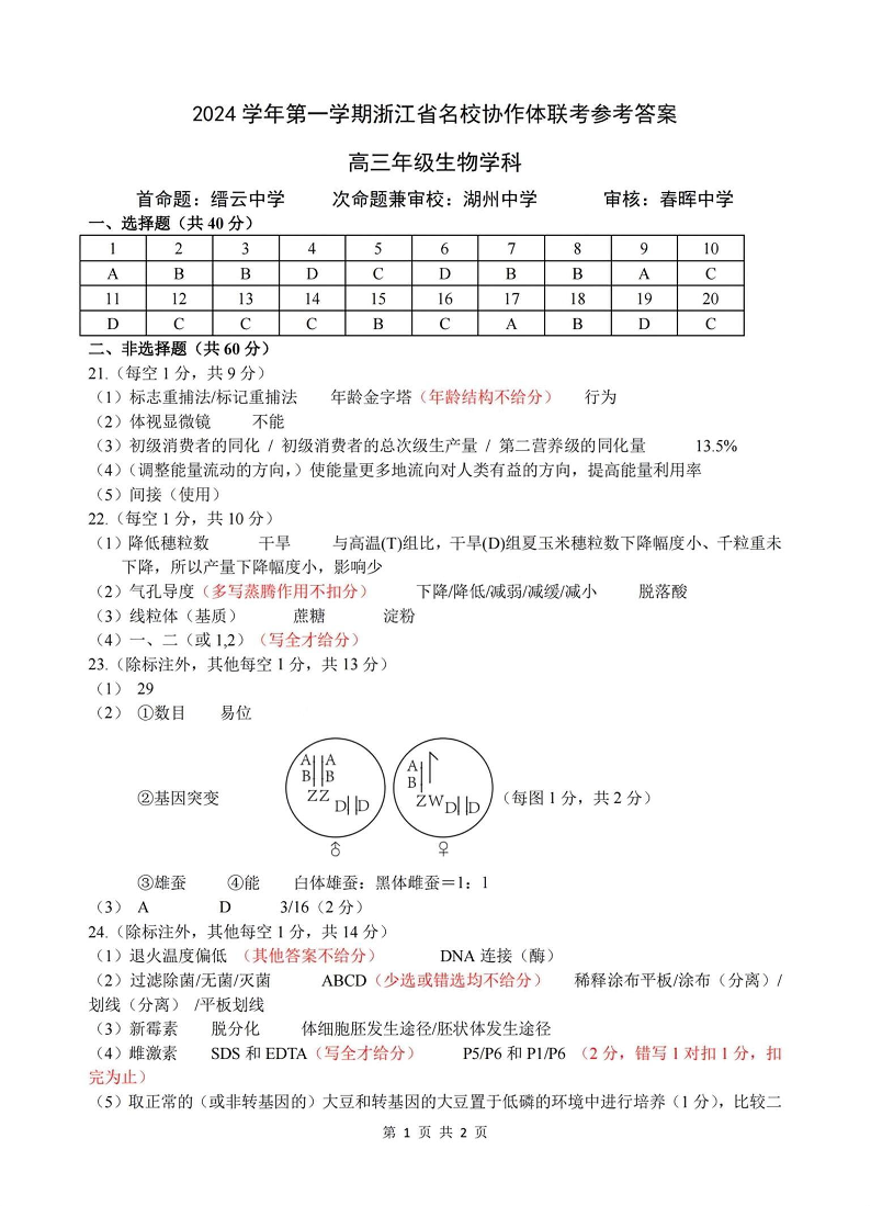 2025届浙江省G12名校协作体高三返校考+生物答案