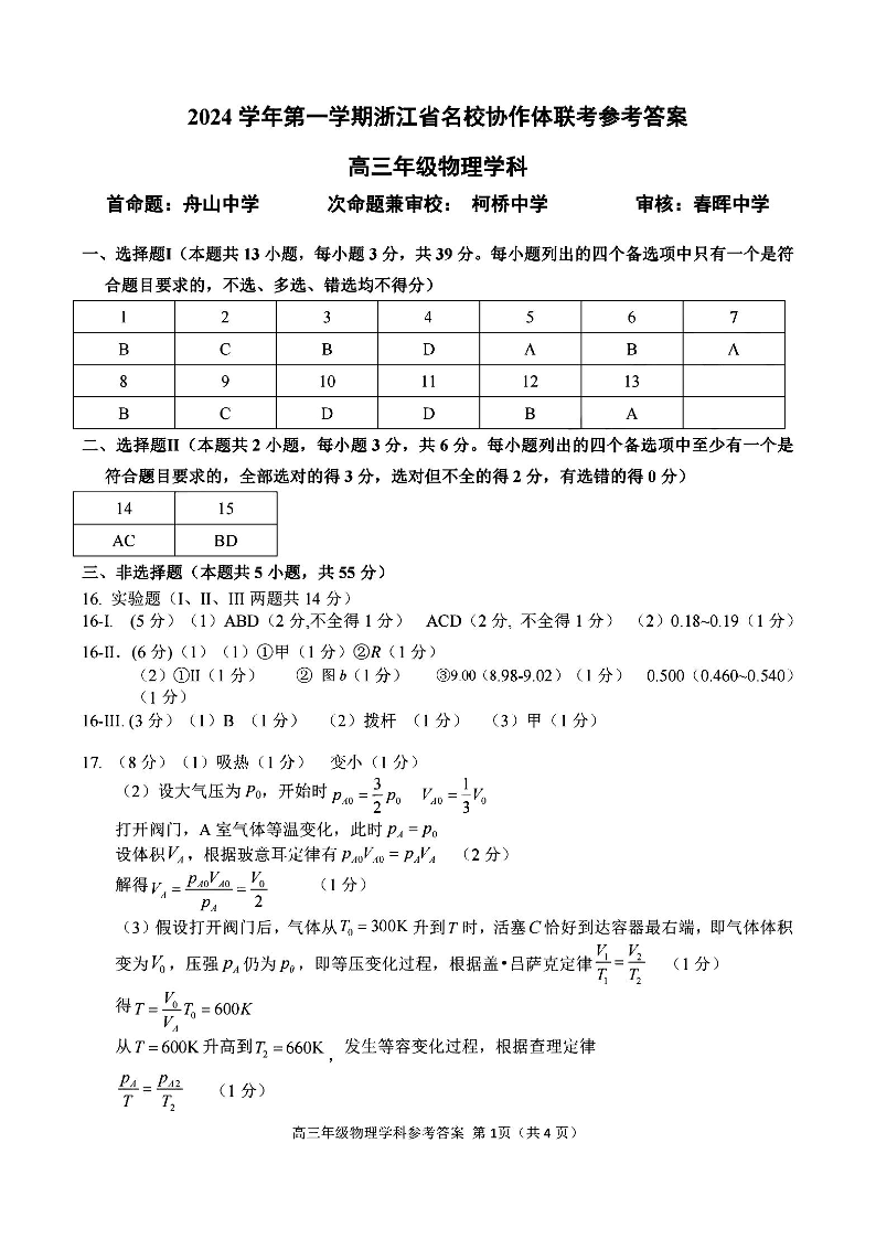 2025届浙江省G12名校协作体高三返校考+物理答案
