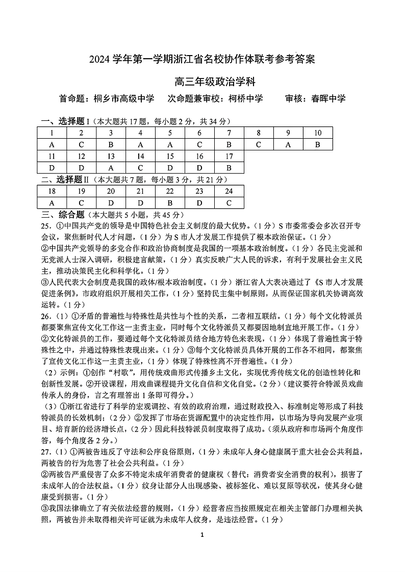 2025届浙江省G12名校协作体高三返校考+政治答案