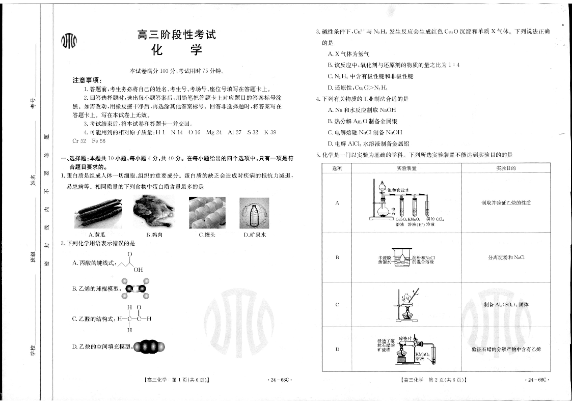 2024届江苏广东福建高三金太阳10月百万大联考 化学