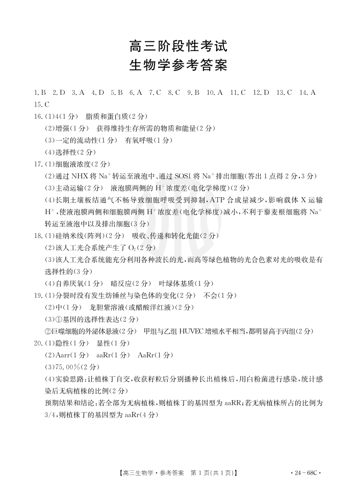 2024届江苏广东福建高三金太阳10月百万大联考 生物答案