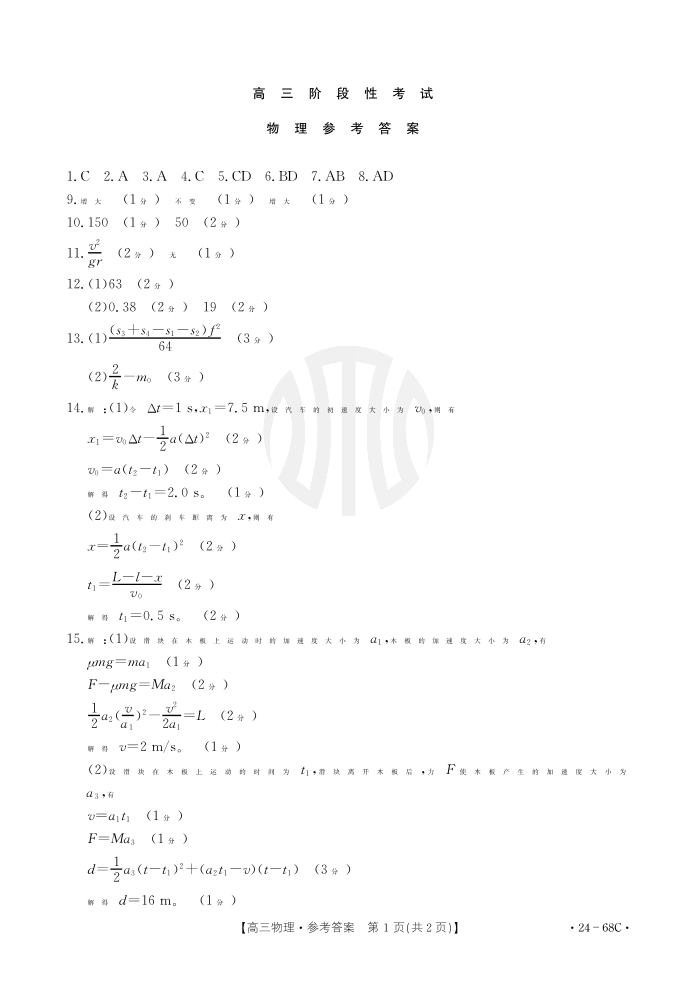 2024届江苏广东福建高三金太阳10月百万大联考 物理答案