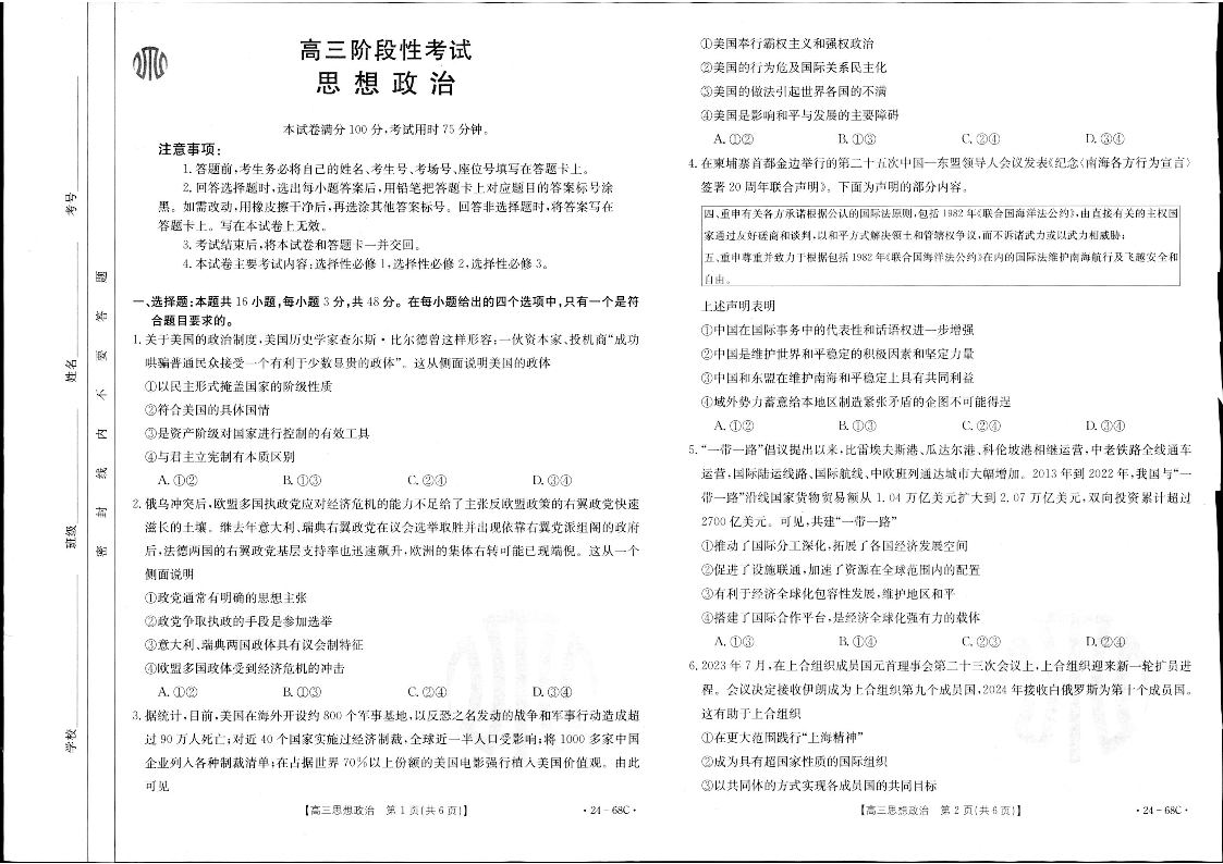 2024届江苏广东福建高三金太阳10月百万大联考 政治