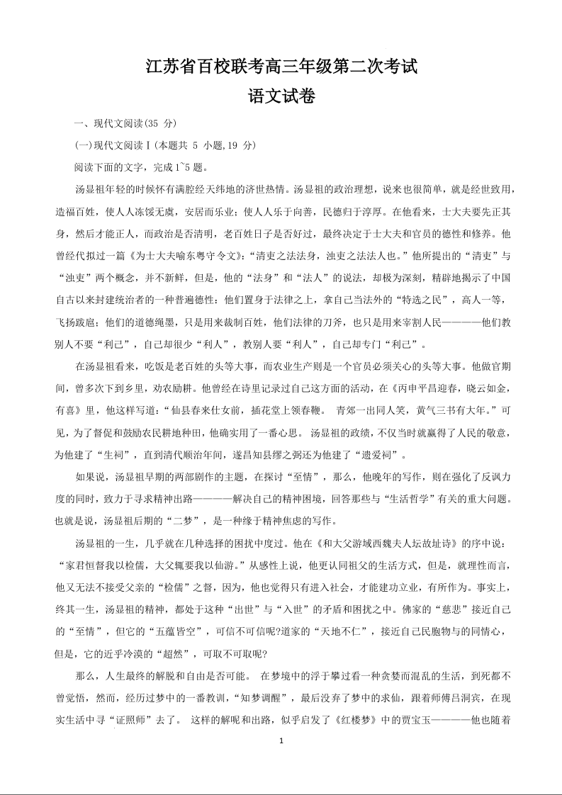 2024届江苏省百校大联考高三上学期第二次模拟预测考试 语文