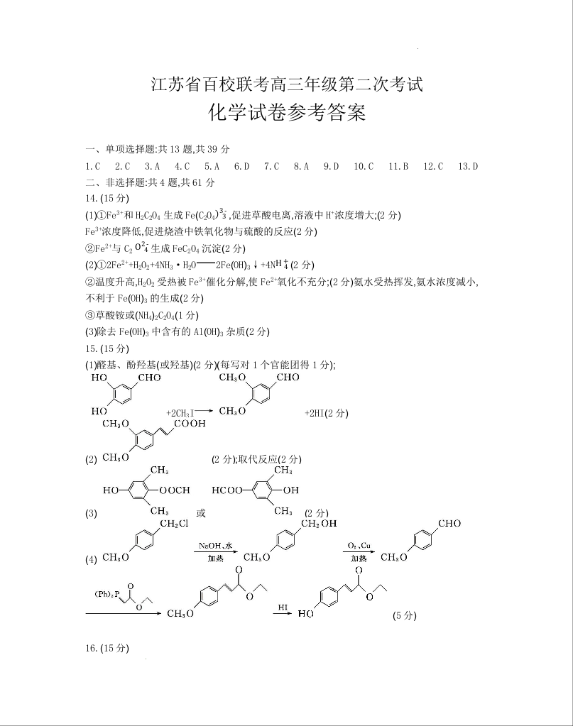 2024届江苏省百校大联考高三上学期第二次模拟预测考试 化学答案