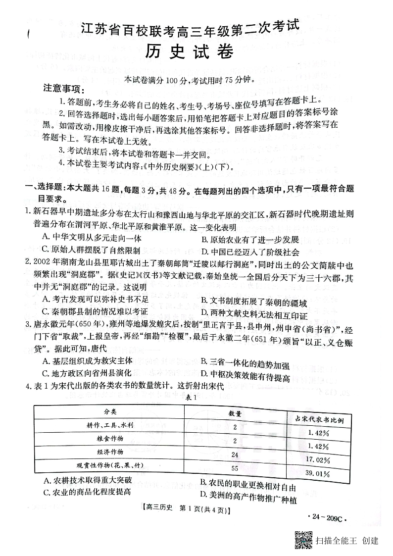2024届江苏省百校大联考高三上学期第二次模拟预测考试 历史