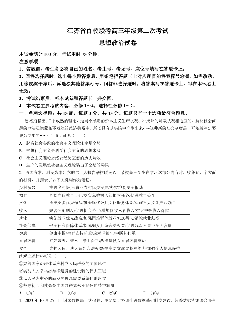 2024届江苏省百校大联考高三上学期第二次模拟预测考试 政治
