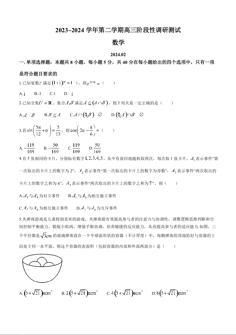 江苏省南通市如皋市2023-2024学年高三下学期2月适应性考试(一)数学