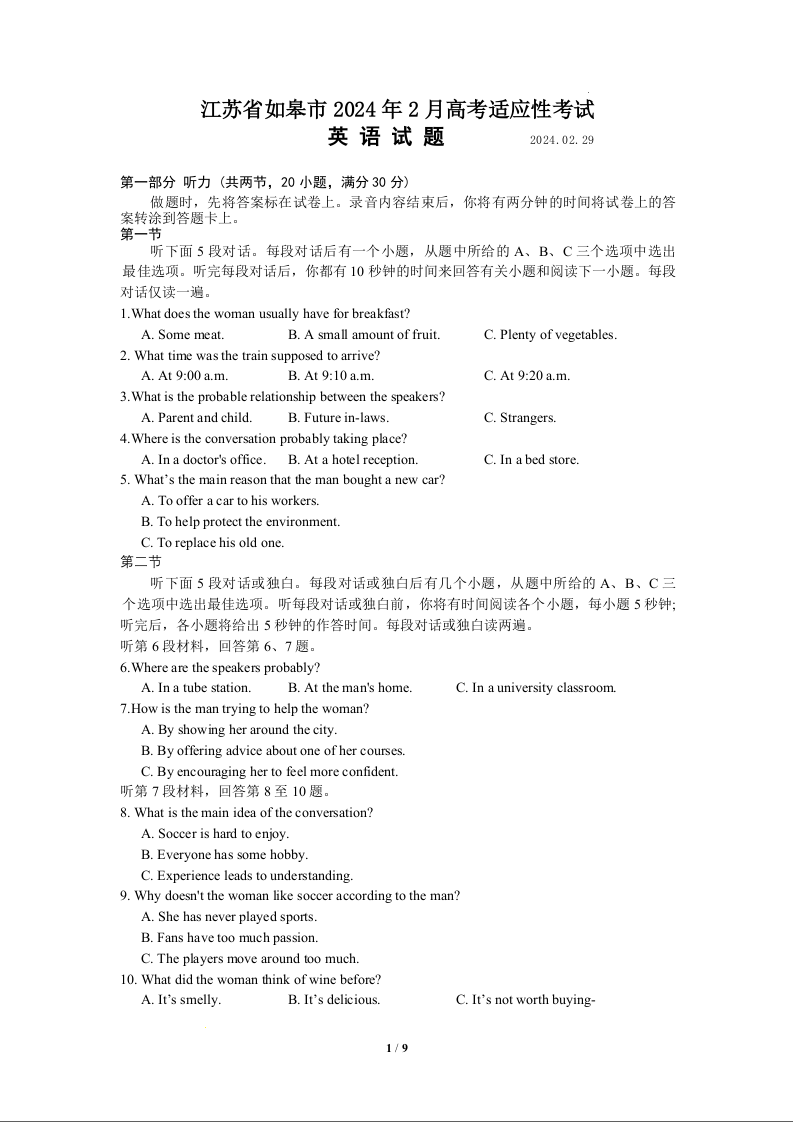 江苏省南通市如皋市2023-2024学年高三下学期2月适应性考试(一)英语