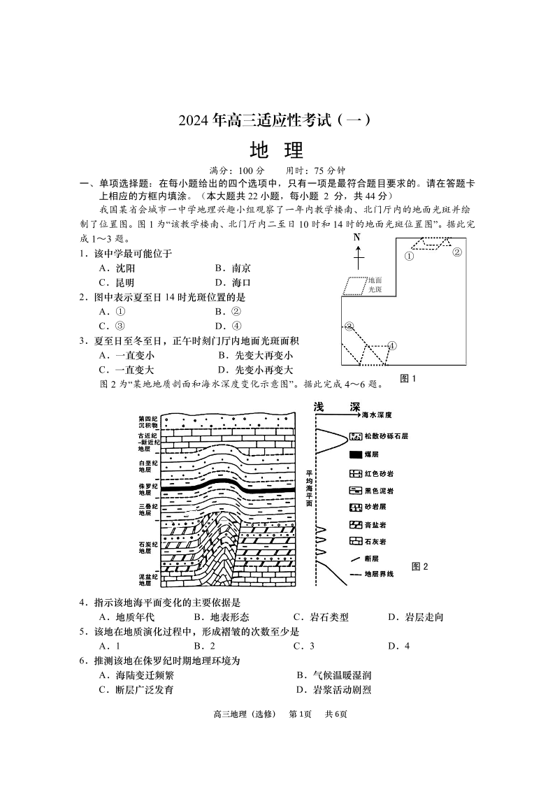 江苏省南通市如皋市2023-2024学年高三下学期2月适应性考试(一)地理