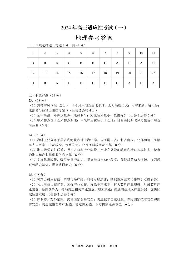 江苏省南通市如皋市2023-2024学年高三下学期2月适应性考试(一)地理答案