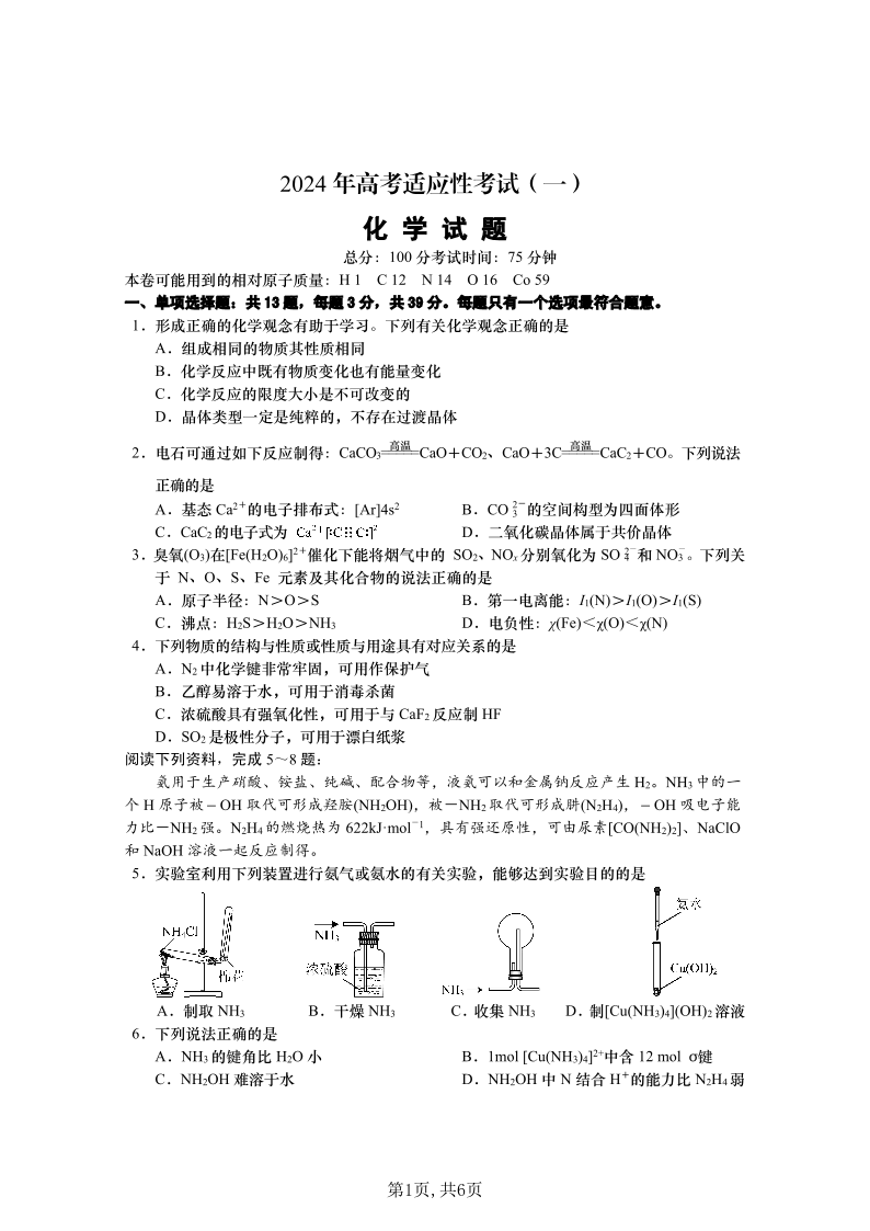 江苏省南通市如皋市2023-2024学年高三下学期2月适应性考试(一)化学