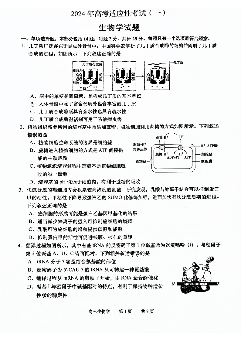 江苏省南通市如皋市2023-2024学年高三下学期2月适应性考试(一)生物