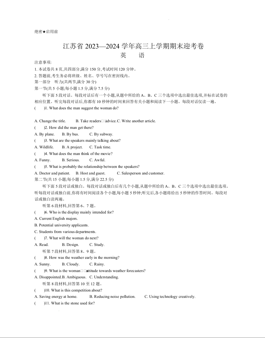 江苏省2023—2024学年高三上学期期末迎考卷 英语