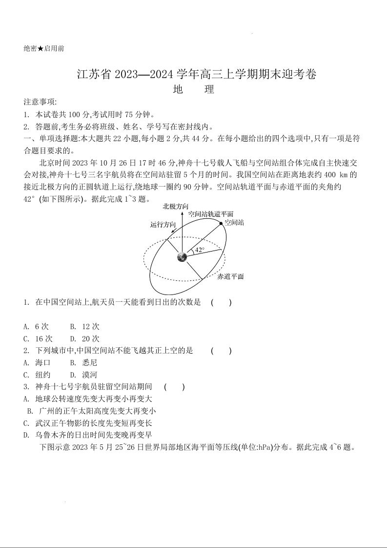 江苏省2023—2024学年高三上学期期末迎考卷 地理