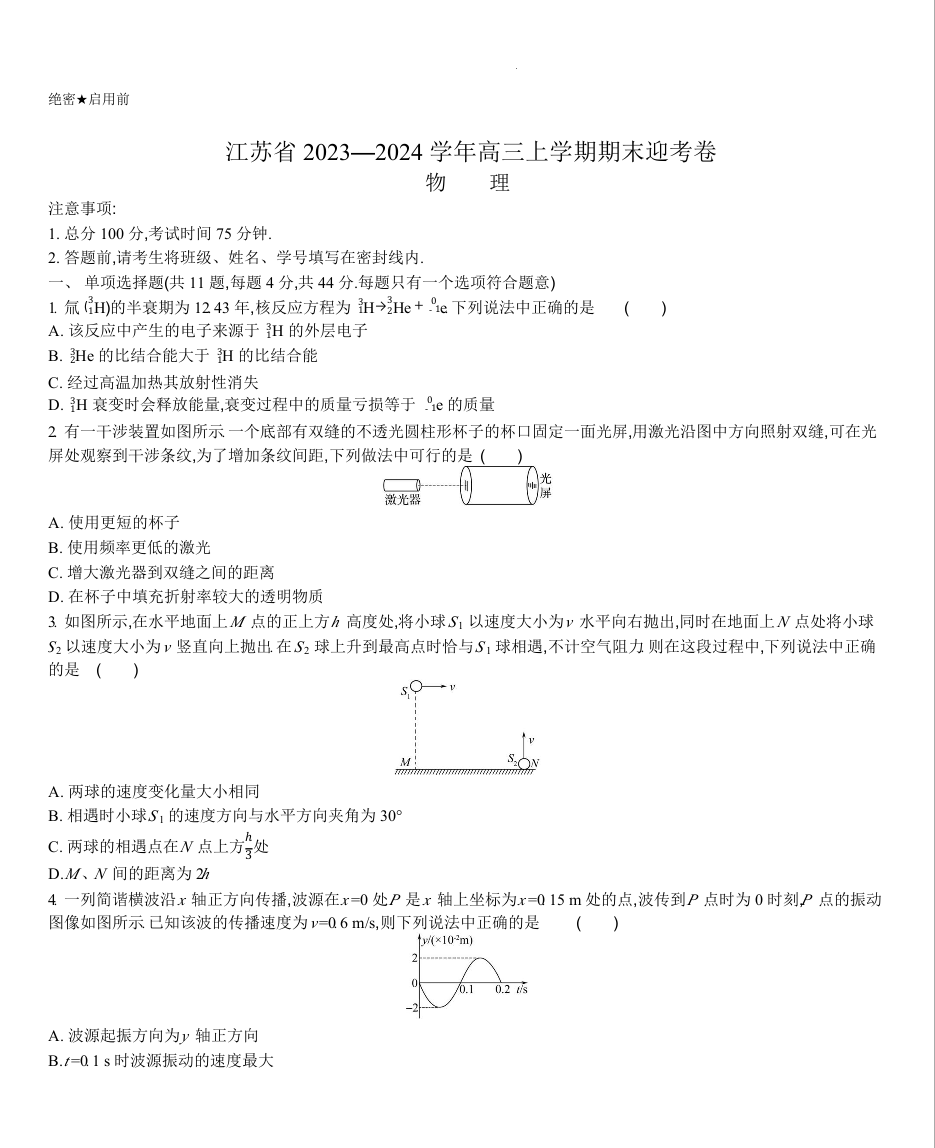 江苏省2023—2024学年高三上学期期末迎考卷 物理