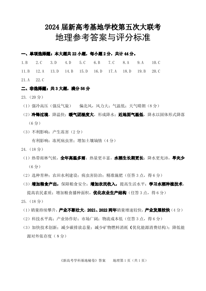 江苏省2024届新高考基地学校第五次大联考+地理答案