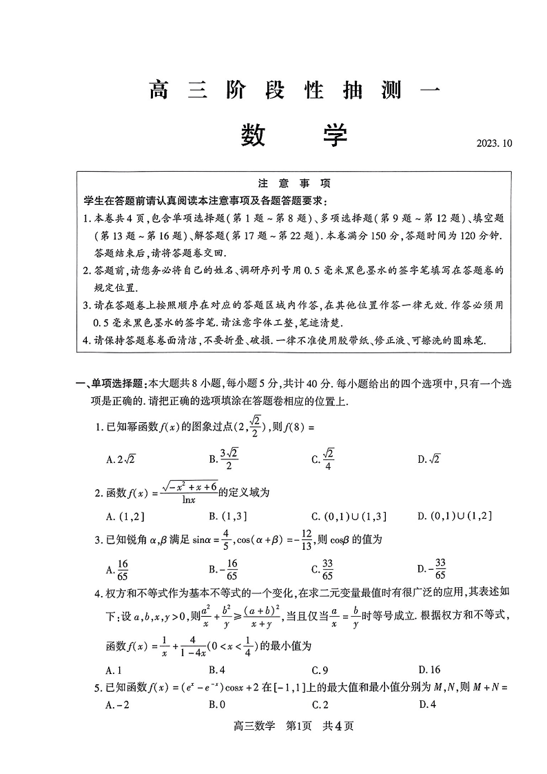 江苏省常熟中学24届高三上阶段性抽测一 数学