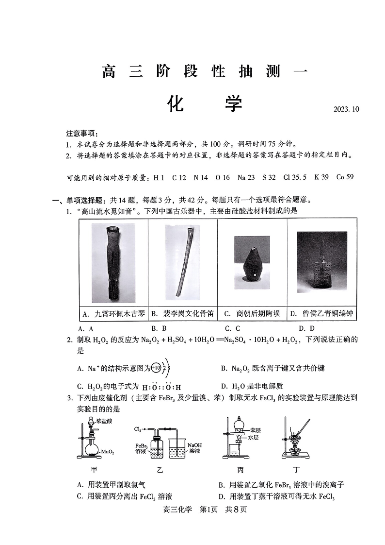 江苏省常熟中学24届高三上阶段性抽测一 化学