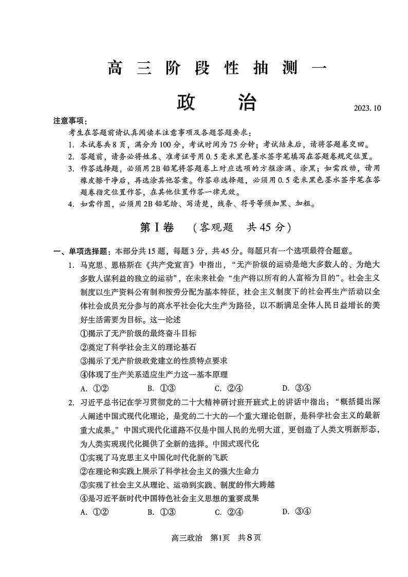 江苏省常熟中学24届高三上阶段性抽测一 政治