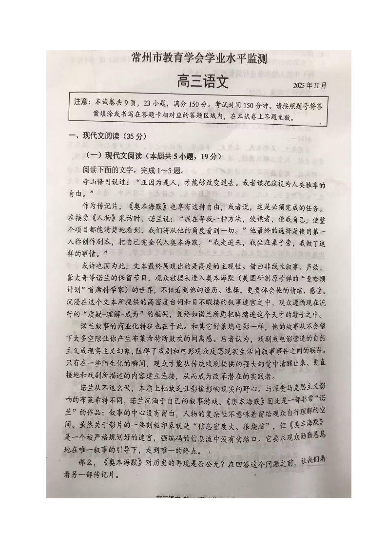 江苏省常州市2023-2024学年高三上学期期中学业水平监测 语文