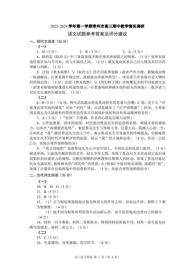 江苏省常州市2023-2024学年高三上学期期中学业水平监测 语文答案