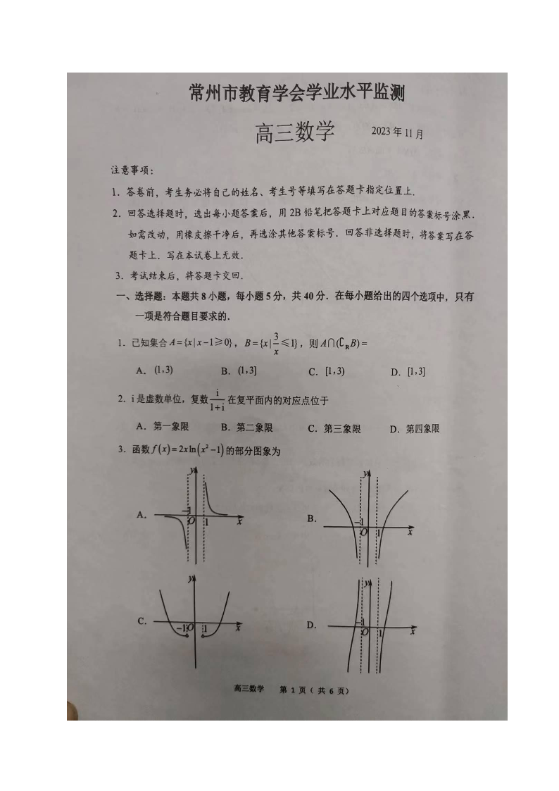江苏省常州市2023-2024学年高三上学期期中学业水平监测 数学