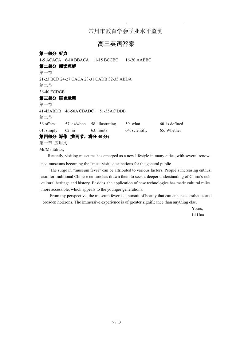 江苏省常州市2023-2024学年高三上学期期中学业水平监测 英语答案