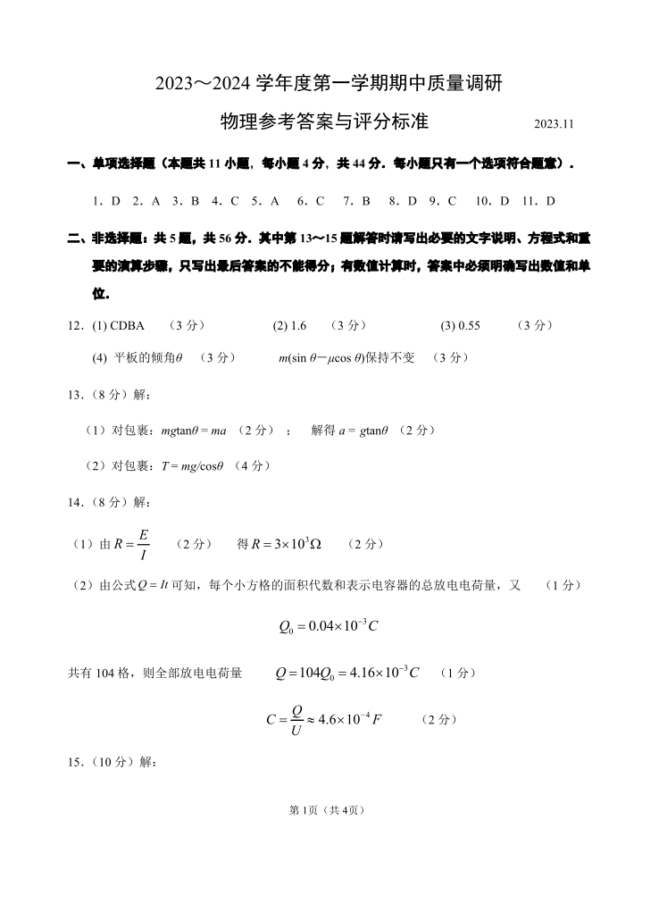江苏省常州市2023-2024学年高三上学期期中学业水平监测 物理答案