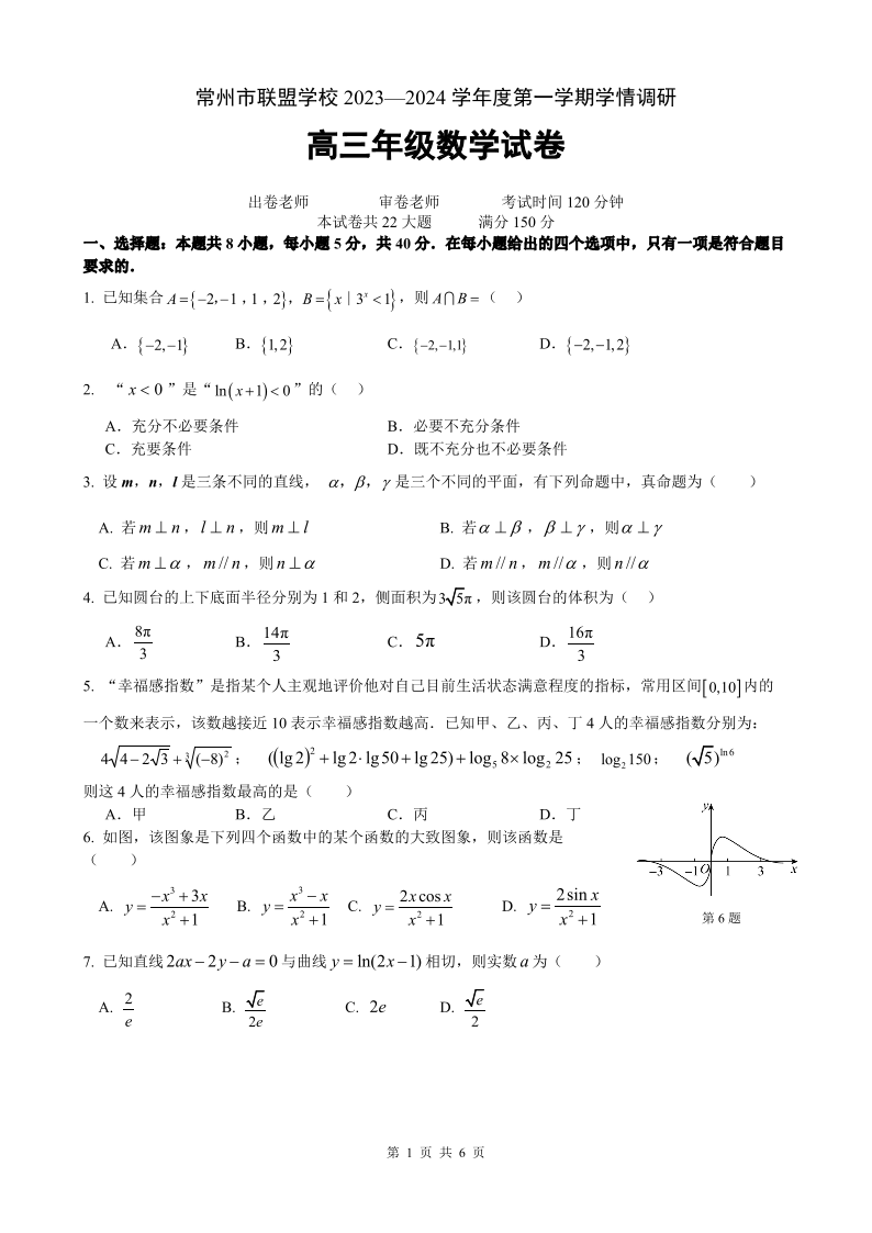 江苏省常州市联盟学校2024届高三上学期10月学情调研 数学