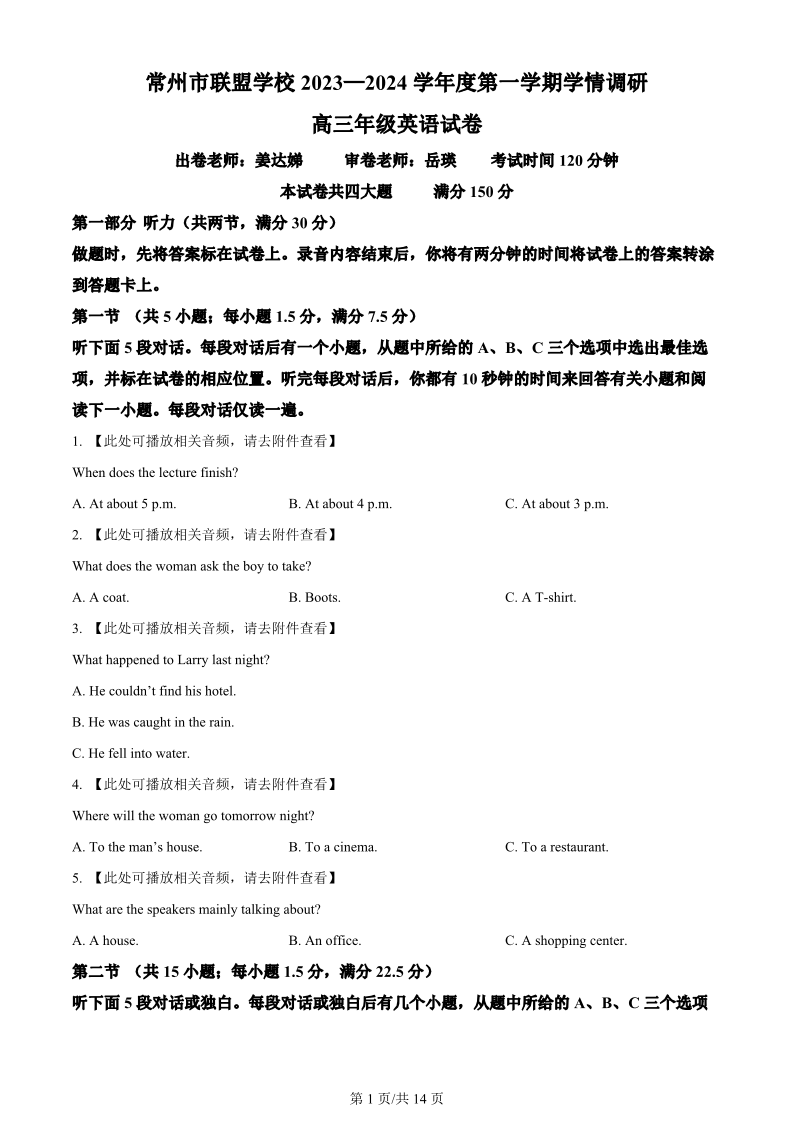 江苏省常州市联盟学校2024届高三上学期10月学情调研 英语