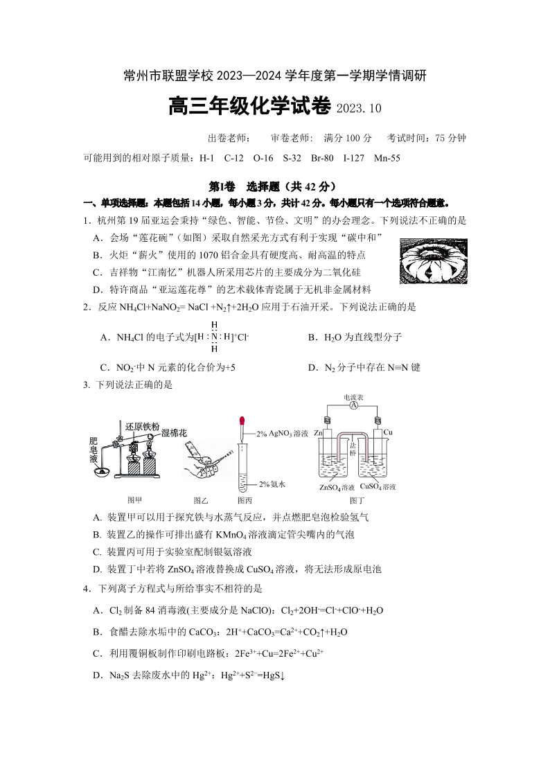 江苏省常州市联盟学校2024届高三上学期10月学情调研 化学