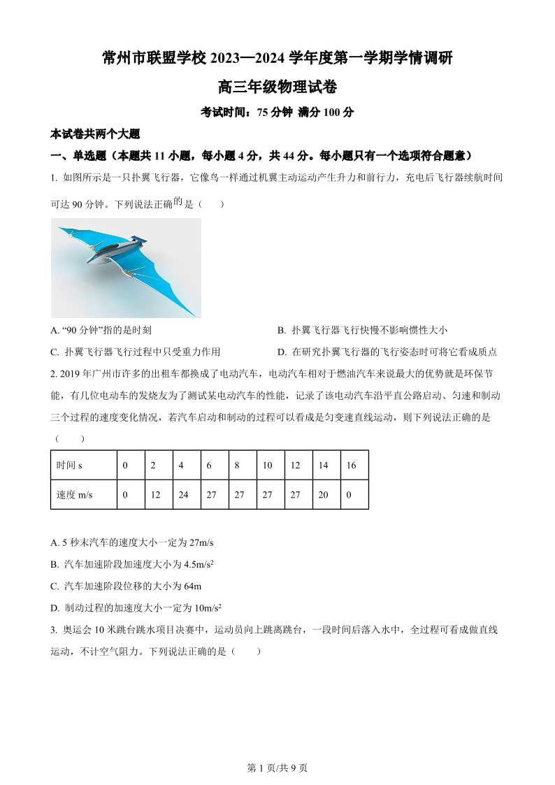 江苏省常州市联盟学校2024届高三上学期10月学情调研 物理