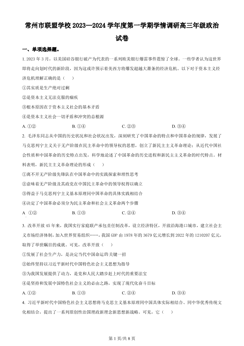 江苏省常州市联盟学校2024届高三上学期10月学情调研 政治
