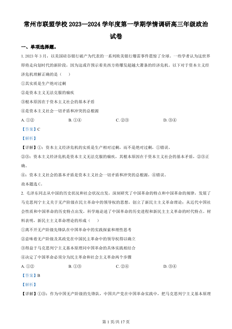 江苏省常州市联盟学校2024届高三上学期10月学情调研 政治答案