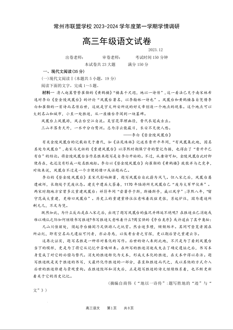 江苏省常州市联盟学校2024届高三上学期12月学情调研 语文