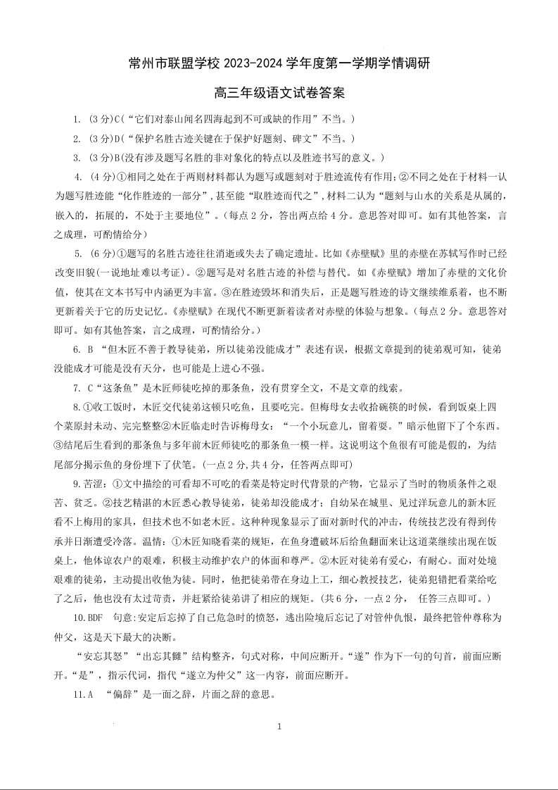 江苏省常州市联盟学校2024届高三上学期12月学情调研 语文答案