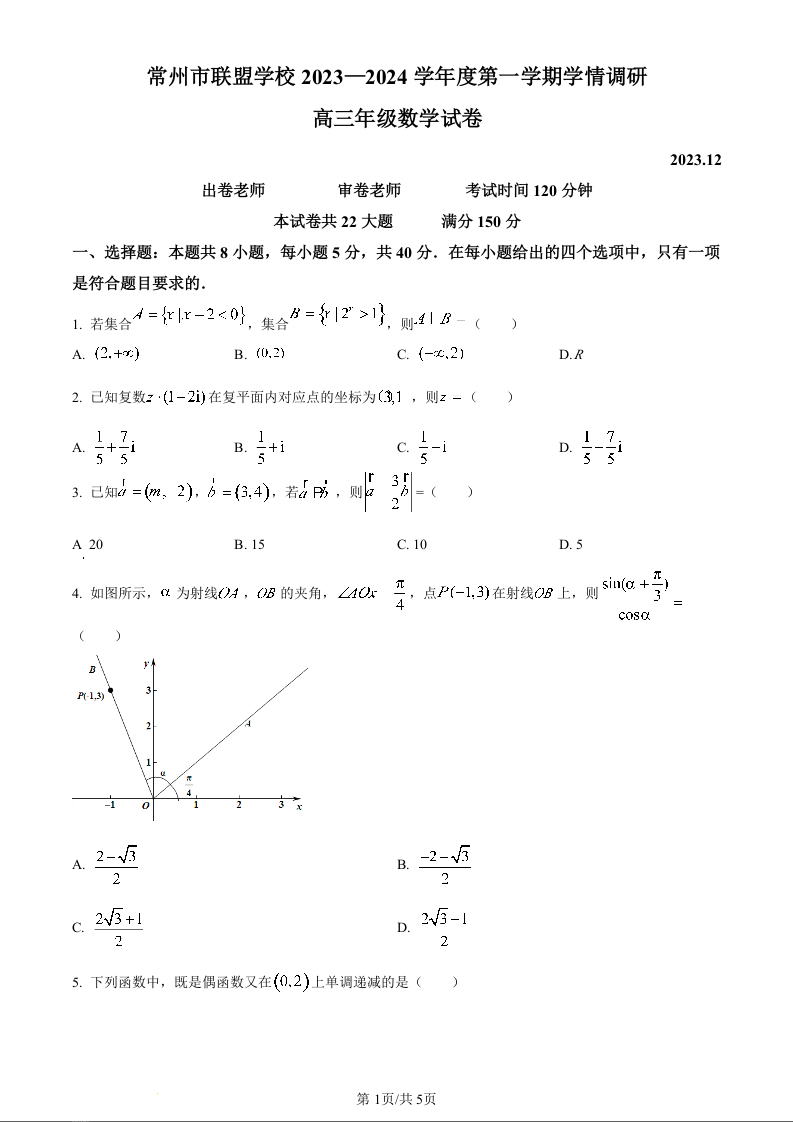 江苏省常州市联盟学校2024届高三上学期12月学情调研 数学